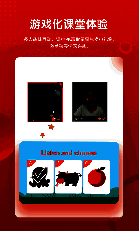 优质北美外教互动强,带着孩子玩着学,趣味教学课件,牢牢抓住孩子的注意力,丰富的课中小游戏,充分激发孩子上课参与感。