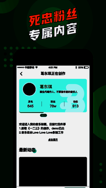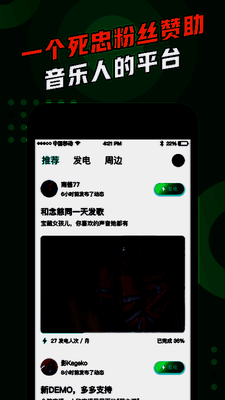为你发电app是一款致力于为更多的音乐人打造的交友新平台,让粉丝们和作者可以更好的交流互动,整体的方式更加的奇妙,点点滴滴的互动方式都是有粘度的,让您不再觉得是无聊的生活,快速的进行一系列更好的展现,支持了一定的原创性质的打气玩法,一起来认识交友试试吧!