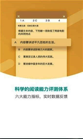 1、科学的阅读能力评测体系:六打能力指标,实时数据反馈;