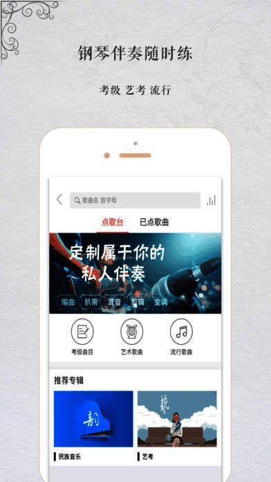 钢琴伴奏是为声乐教师以及声乐学生提供声乐、考级艺考的钢琴伴奏音乐及歌词,搜索曲目直接播放伴奏,包含考级曲目、艺术歌曲、流行歌曲,民族音乐,艺考曲目等;