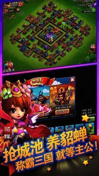 游戏多点触控的操作,酣畅淋漓的战局,玩家通过兵种搭配以及防御工事构建,来完成一只尖锐的部队以及固若金汤的城池防御,战斗过程中,通过不同兵种的特性,通过手指以及头脑的判断来完成一场场刺激的战斗,同时通过对胜利后城池的掠夺来获得发展关键需要的银两和粮草。初期玩家通过对周围难度不一的残余势力进行挑战进行发展和对游戏熟悉,当你小有成就的时候,即可挑战玩家城池。