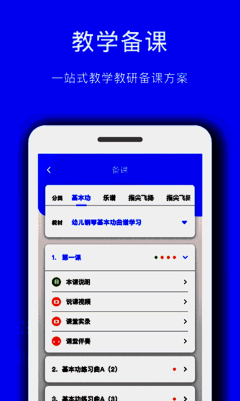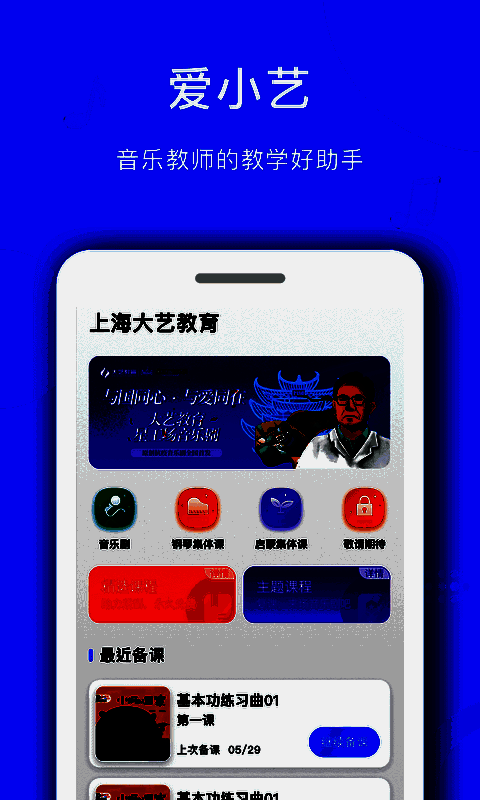 “爱小艺教师端”APP,是爱小艺针对琴行机构定制化研发的一款智能备课辅助产品;机构教师可以在上课前,在备课功能内查看每一课的教学讲义、说课视频、课堂伴奏等内容。通过这些精心准备的教研指导,任何一位教师都可以轻松地上好每一节音乐集体课。