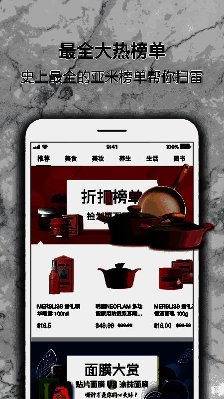 4、榜单,拥有折扣榜单、热销榜单、新品榜单、美食榜单、美妆榜单等;