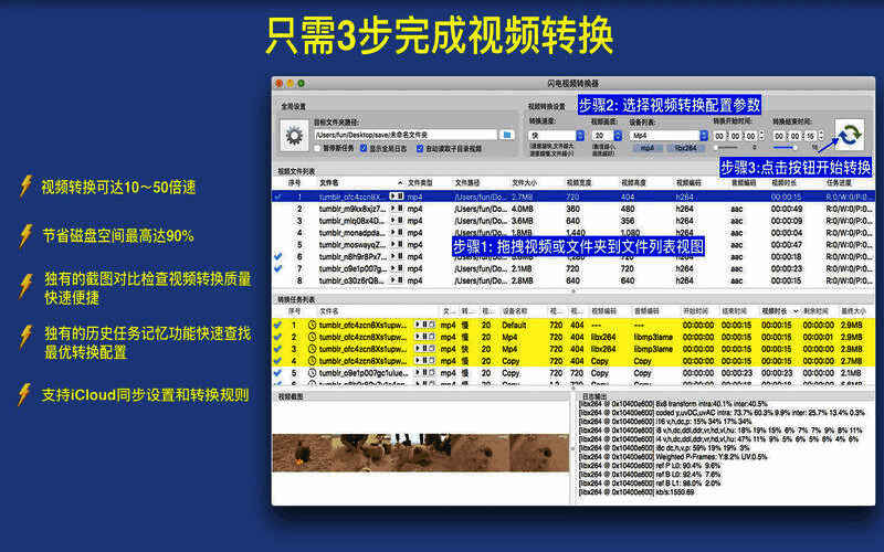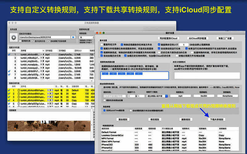 5、支持iCloud同步软件设置和视频转换规则。用同一个Apple ID等登陆的多台设备可以同步软件设置,所有闪电视频转换器的用户可以同步视频转换参数,用户可以直接使用别人的转换参数,极大的节省用户时间。
