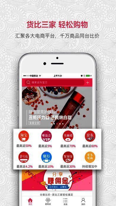 3、购物返利:搜索购买各大电商商品即可获得返利,最高返利比例可达商品价格的50%,用户平均累计返利超过1000元;