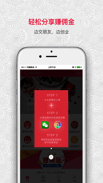4、分享赚佣金:将本应用分享给好友,好友安装后即可收取分享红包,分享越多红包越多,赶快分享吧。