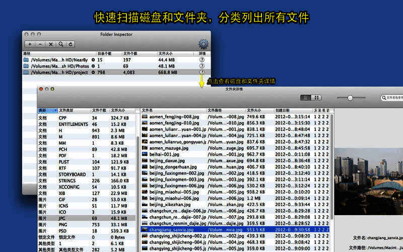 2、快速计算出每种类型文件数目和占用磁盘大小;