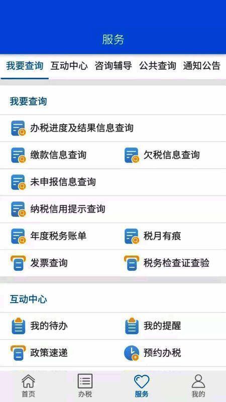 纳税人可通过该部分操作“我想查询”、“互动中心”、“咨询咨询”、“公开查询”、“通知公告”五个功能类别。
