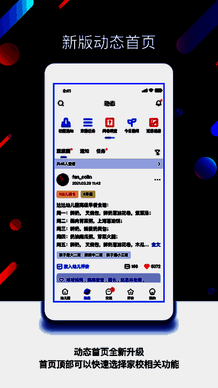 “儿童通过家庭互动”以“儿童”为中心,集文字、图片、视频、实时交流于一体,全面关注儿童在家中的生活、运动、游戏、学习和健康成长,记录和分享关于儿童的点点滴滴。帮助幼儿园园长轻松掌握幼儿园动态,帮助老师随时与家里沟通,帮助家长跨时空了解孩子在幼儿园的真实生活。实现并构建教师、教师与家长、家长与家长之间的实时互动。它是幼儿园校长和老师的贴心助手,也是家长喜爱的家庭互动平台。