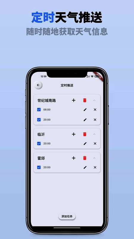 通过这个软件,你可以第一次了解天气和温度的变化,PM2.5的空气质量会随着时间的推移而变化,一旦有风吹草动,你可以立即查询。我们可以同时将多个不同的城市添加到您的手机中,这样您就可以在不切换的情况下立即了解相关的不同场景,您还可以添加需要在软件上完成的各种任务
