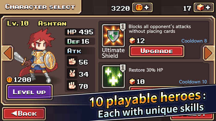 1、游戏采用了像素风格的画面设计,不少休闲游戏对于这种画风还是非常执着的,在游戏中一共有10个英雄,而这10个英雄的职业都是不一样的,不过都是一些玩家们所熟悉的职业了,魔法师、战士、刺客等等,不同的职业攻击的方式都是不一样的;
