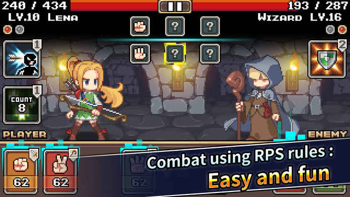 游戏采用了像素风格的画面设计,不少休闲游戏对于这种画风还是非常执着的,在游戏中一共有10个英雄,而这10个英雄的职业都是不一样的,不过都是一些玩家们所熟悉的职业了,魔法师、战士、刺客、**手等等,不同的职业攻击的方式都是不一样的。游戏里玩家在与敌人决斗时会采用猜拳的方式,猜拳谁赢了就会攻击一次对方。所以玩家在与敌人对决时一定要想好出拳的顺序。