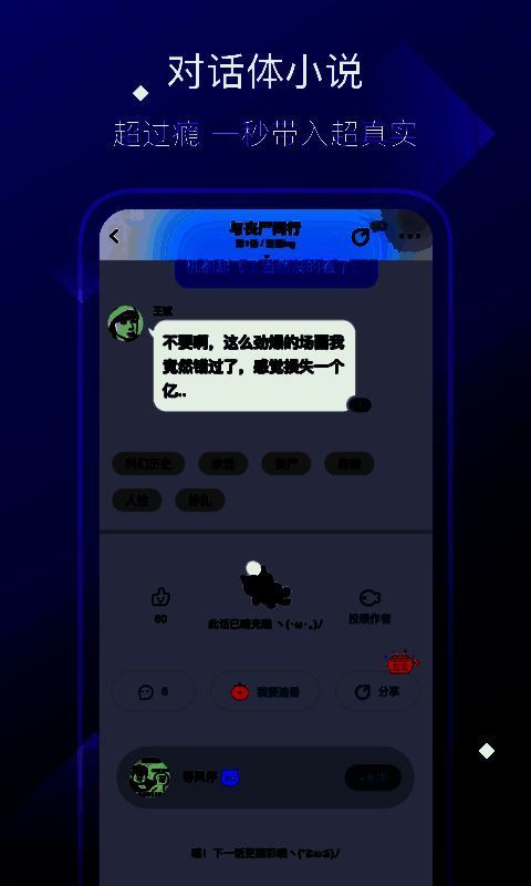 快点对话式小说,年轻人都在玩的火爆全网的小说神器。《快点》是一款采用的新颖的阅读方式的对话式的小说阅读软件。在快点软件内,你可以体验到看小说,就像是在聊QQ、看微信一样。只需要轻松的点击即可弹出对话小说。你还可以发布表情包,还能进行评论哦。感兴趣的小伙伴们快来下载吧。