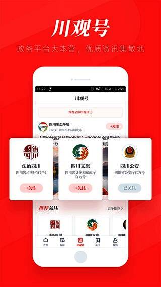川观新闻app是一款非常不错的新闻阅读阅读类的文章,是由四川日报报业集团专为四川省的用户研发的权威的新闻资讯服务平台,这款软件致力于为用户提供更新鲜、更及时、更热门的实时资讯内容,在这里,你可以浏览本地新闻,随时随地了解发生在身边的大小事。除此之外,这个还汇聚了诸多高端人士,提供专业的政策解读。