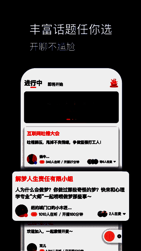 1、是一个与朋友和世界各地有趣的人随时进行音频对话的空间,互动轻松方便;