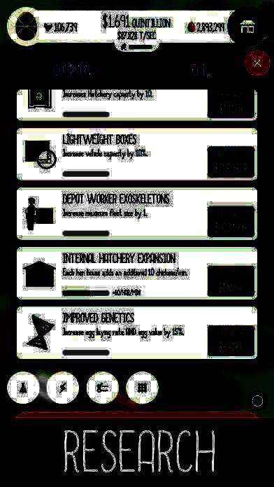 《鸡蛋公司》(Egg Inc),玩家需要在游戏中以点击的方式来使母鸡成长,之后利用产下的鸡蛋赚取金钱,完善农场设施。在发展过程中,玩家可以攀升自己的科技,使得无论是母鸡生蛋效率,还是鸡蛋价值亦或是小鸡成长回复时间,都能够朝着获得更大利益的方向发展。最终,解锁更为珍稀的蛋种,完成游戏的终极目标。