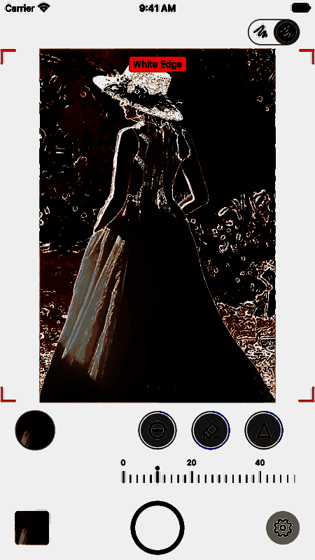 3、临摹相机点击预览图手动对焦,预览图两指缩放变焦,自动裁剪将以遮罩图比例裁剪照片;