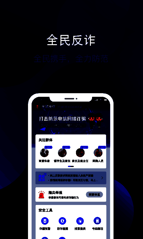 1、全民反诈帮助用户预警诈骗信息、快速举报诈骗内容、提升防范意识的反电信诈骗应用。