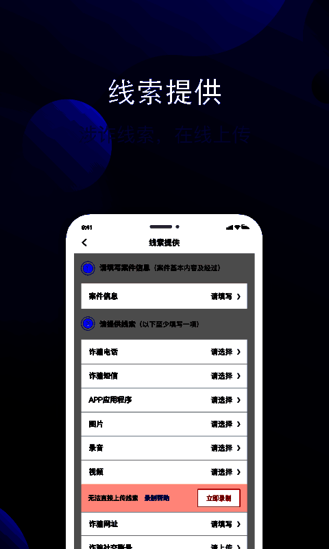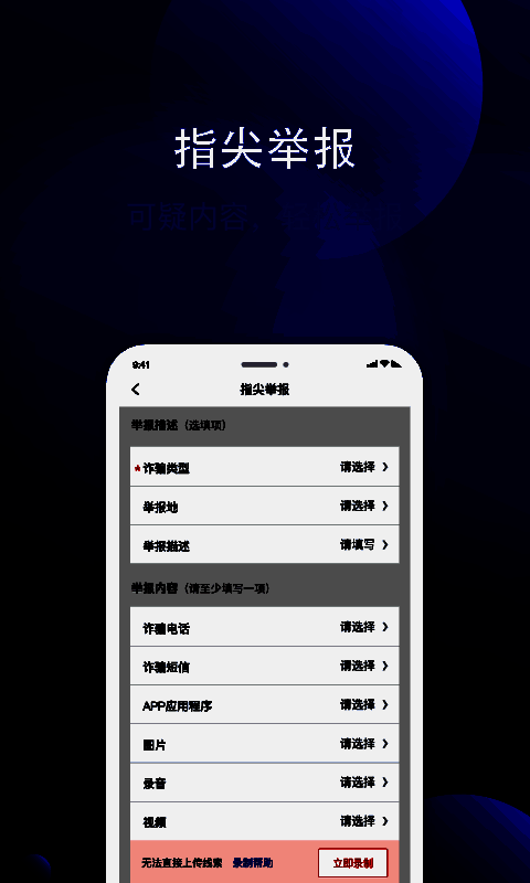 2、可以快速的举报诈骗内容帮助他人提前防范,还是可以一键开启录屏录音,上传诈骗线索。
