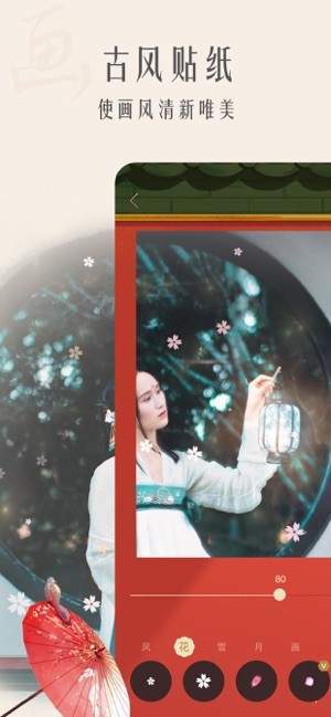 结合古代文学作品描写自然景物的四种对象风、花、雪、月作为贴纸,古代元素的印章、画框。好看又实用的古风元素,让你的照片更添诗情画意。