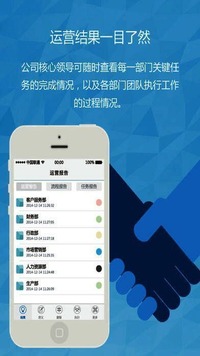 2、业务场景:目标分解规划、任务执行实施、绩效结果考核、移动考勤管理、业务流程管理、连锁分支机构管控、外包质量监控、团队卓越经验积累和内部一键分享、一键复制内部运营模式、个人便签等。