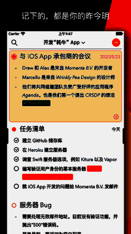 作为唯一款注重时间跨度的笔记 App,它能够完美迎合各种项目需求。将它用于个人项目,记录您想尝试的食谱;或者用于工作中的重大项目,计划您的下一次会议,检查您的日常待办事项。
