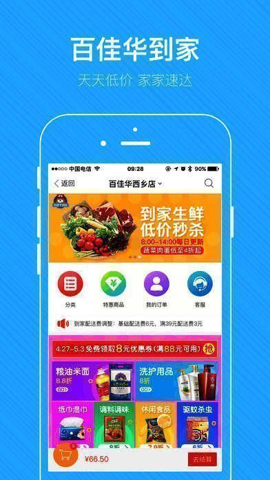 6、【百佳华到家】百佳华商场3公里范围内,可享受2小时产品送到家服务。