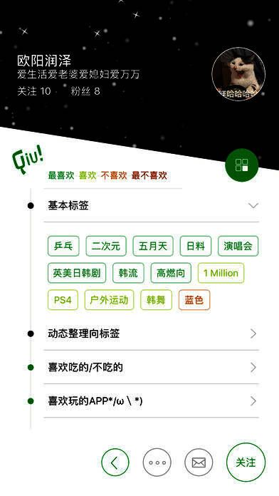啾不念秋app是一款非常有趣的兴趣交友软件,通过不同颜色的标签记录自己或TA感兴趣的事物的喜好程度,提醒自己不要做不喜欢的事情,以免造成不必要的麻烦。还能因此提高交友效率,促进彼此关系。