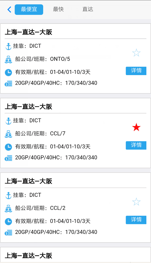 3、净清爽的界面,让您查整箱,拼箱运价时更加愉悦快捷,及时收藏关心的运价,拖车仓储等数据全都实时更新,24小时不断刷新的九爪头条让您更快的掌握海运行业的大事件,快人一步;