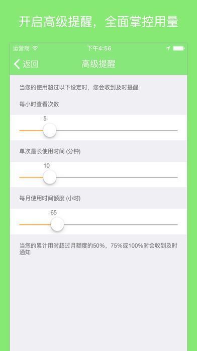 1、设置每日使用时限,随时监控手机使用,当你达到用量的50%,75%, 100%时会收到提醒;