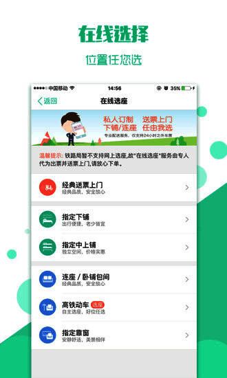5、【在线选座】靠窗、靠走道、优选下铺、同包厢,自选指定席位,送票上门;