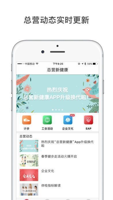 总运营新健康是一款健康资讯服务APP,它提供了计步、工会活动、企业文化、EAP等多项的应用功能,随时都可以查看到自己喜欢的健康资讯信息,帮助你快速的增长自己的健康知识;随时即可关注到健康实时快讯,了解到基本详细的情况内容,提供更加有趣的资讯信息,让你随时都可以掌握到更完善的健康信息;可以把健康的资讯内容分享至多个社交圈,让大家一起参与体验。