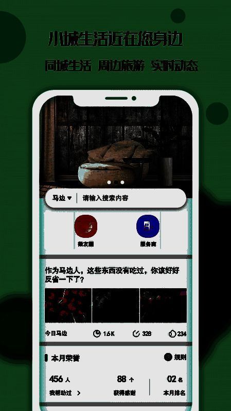 微友圈:SNS共享生活社区,支持图片、文本、定位发布动态,多种动态分布,快速查询动态信息,点赞与评论互动,共享边城生活的点滴,和发朋友圈一样简单;