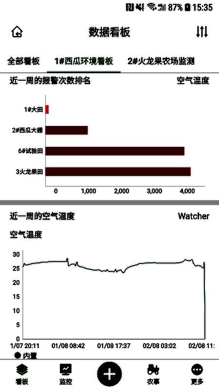 《农场守望者》是一款十分给力的农场监控类软件,这里有着数据看板,还有近一周的报警次数排行,近一周的空气温度指数,高清监控视频,大量的实验田地,各种计划,记录,今天,以后的记录都会有哦,众多蔬果,施肥等,为您守望天地间,耕耘一方田!喜欢这款农场软件的朋友就来这里下载吧!