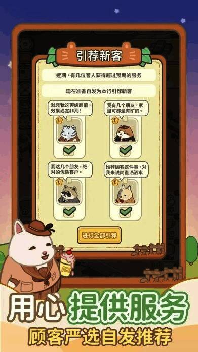 在《动物钱庄》中,玩家不仅要妥善管理银行日常事务,还需灵活应对各种突发状况。你可以通过不断升级设施、招募优秀员工来提升服务质量,吸引更多顾客光临。同时,丰富的任务系统与随机事件设计,也为游戏增添了更多不确定性与挑战性。无论是为仓鼠先生办理存款业务,还是协助兔子小姐定制专属理财计划,每一次服务都是一次全新的互动体验。
