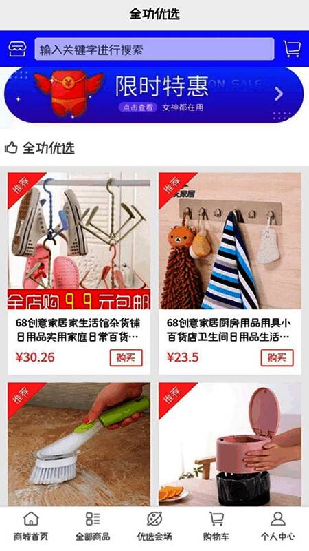 全功优选,应有尽有。《全功优选》是一款超省钱的购物软件。在全功优选软件内,拥有着海量的商品资源,各种类型的商品,实时更新,你想买的,应有尽有。更有相应的大额的优惠券可以免费领取,优惠力度高于50%以上屡见不鲜。软件首页更有各种优惠版块,轻松省钱就是这么简单。