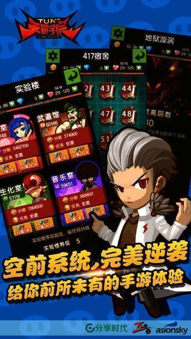 天霸学院是一款二次元回合制Q版RPG手游,游戏画面是精致的日系卡通风格,加上丰富的玩法和跌宕起伏的剧情,天霸学院带你体验最爽快的游戏玩法,喜欢的赶紧下载吧!天霸学院是一款二次元RPG手游,陈赫担任游戏制作人。打地鼠,天天消除,无尽之塔,诡异闯关、探索解谜、百种元素,乐趣无穷,丰富的技能和真实的打击感会给你带来爽快的操作体验和强烈的视觉冲击。