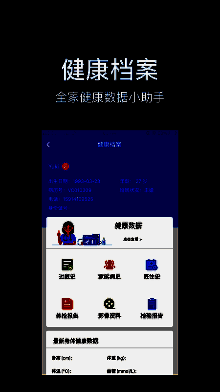 健康档案,管理您的健康:永不丢失,全数据化健康信息,体检报告,门诊病历等一并管理。