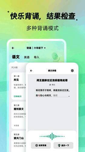 在最新的v2.5.5版本中,百晓松学习进一步增强了实用性。新增了听背诵录音功能、模糊音匹配设置、学习素材库(如手抄报和打印模板)、必背古诗词目录等功能,同时优化了背诵判定规则并修复已知BUG,整体使用体验更加流畅。