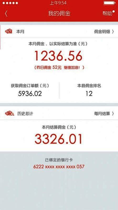 1、打开这里,推广员可以实时查看自己本月的销售额和待结算佣金,以及在本县的排名情况。