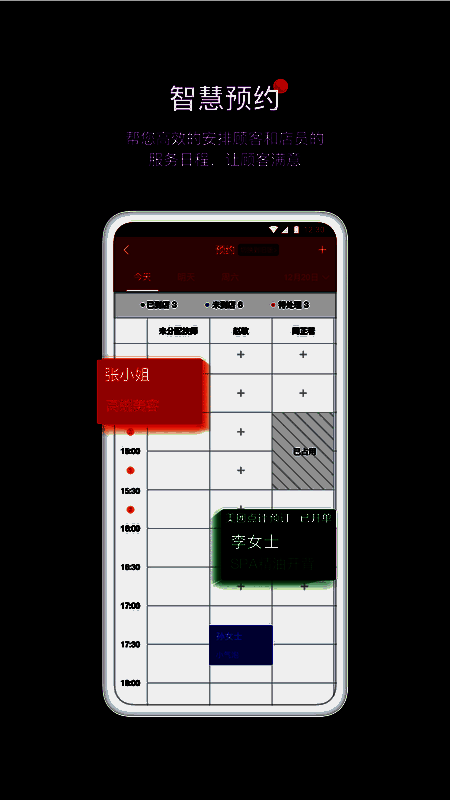 2、与微信,美团和公众评论建立联系,以帮助商家快速接收和确认约会,并智能地为文员和客户安排服务时间表;