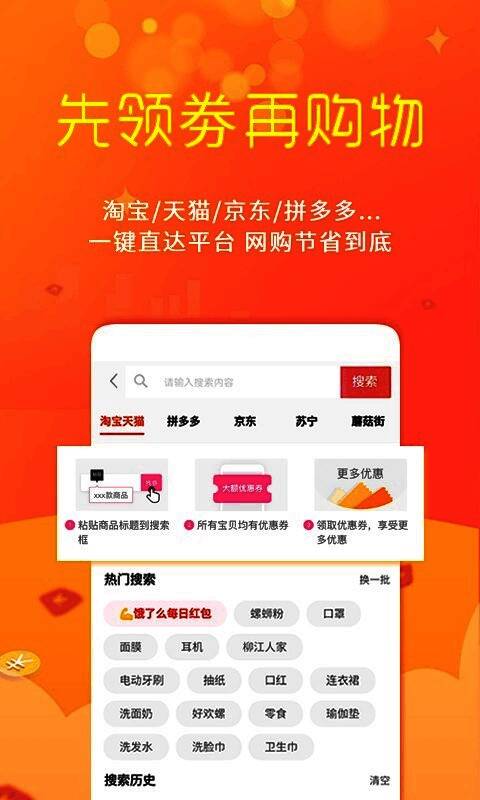 1、搜券功能:在多种商城复制宝贝标题后,打开应用可以自动识别一键搜索多种商城商品优惠券。