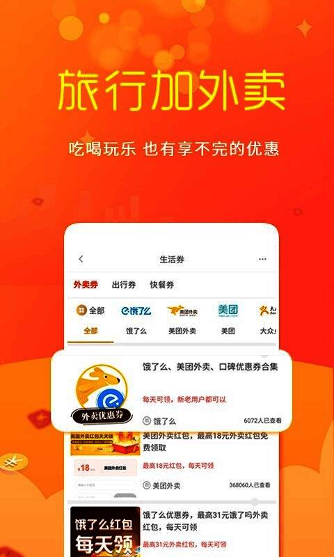您还能在平台查看许多生活优惠券,例如:外卖券、出行券、快餐券等;
