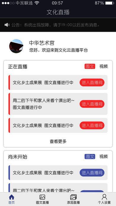 文化直播是一款专为文化机构量身订制的直播APP。可以提供包括图文直播、视频直播在内的整套直播工具,并支持使用者编辑、置顶、推送与用户交互等功能。使用便捷,易于操作。能够帮助文化机构顺畅、快捷、丰富的报道活动现场及事件,是互联网文化工作者不可或缺的宣传工具