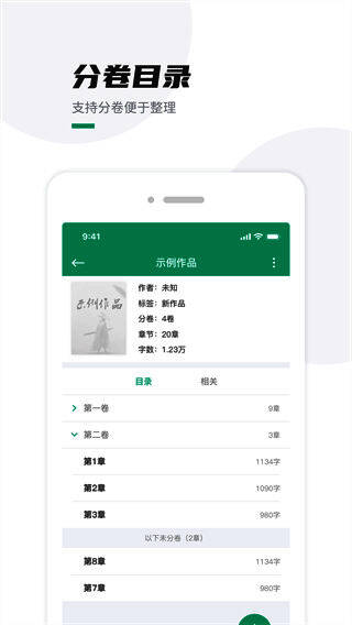 除了基础编辑功能外,《口袋写作》还配备了命名助手、撤销与反向撤销机制、目录跳转等功能,大大提升了写作效率。此外,它还支持将作品按卷分区管理,并提供长图分享选项,方便作者在社交平台上展示自己的成果。