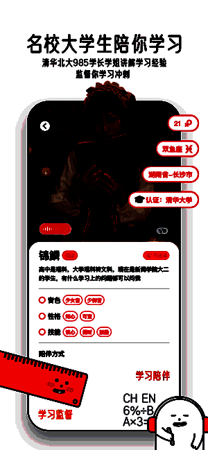 2、清华北大985名校学长学姐陪伴你学习,讲解学习方法,考试季强力监督带你冲刺;