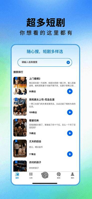 作为一款专为短剧打造的平台,《悟空剧场》汇集了多种题材和风格的热门作品,无论是经典老剧还是最新上线的新作,用户都能在这里找到心头所好。同时,平台每日更新榜单,帮助用户快速锁定当下最火、最受欢迎的短剧内容,让追剧不再“剧荒”。