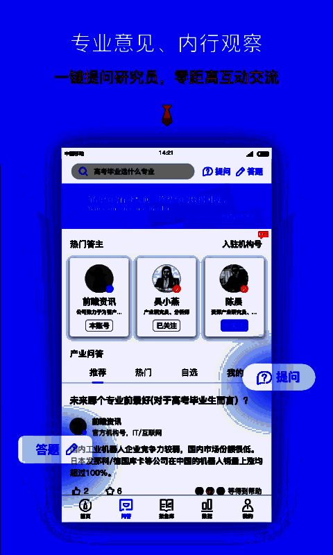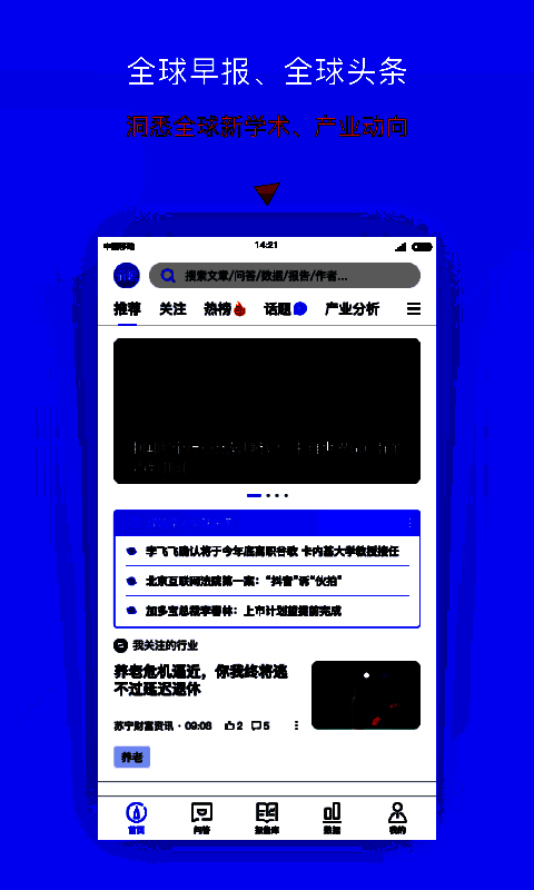 聚合各类优质媒体、行业大V:腾讯研究院、中国信息通信研究院CAICT、创业邦、猎聘网、IT桔子、智联招聘、凤凰周刊、苏宁财富资讯、互联网品牌官、娱乐独角兽、网易研究局、新浪科技、港股那点事、汽车公社、动漫经济学、华夏时报、火星财经、功夫财经、棱镜等;聚焦大事资讯、精选热点,世界那么大,你想去看看?前瞻经济学人满足好奇心与深度阅读需求。