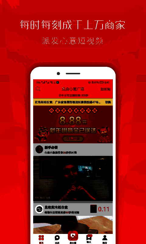心意短视频app是一款专门为用户们打造一个全新的短视频赚钱软件,心意短视频app里拥有各种好看好玩的短视频,并且超多的商家会被用户们带来海量的红包,不仅可以看视频,还能跟视频up主实时互动,还有超多带着诚意的商家入驻,用户可以看他们的视频广告领取佣金!想要赚钱的小伙伴们千万不要错过了。