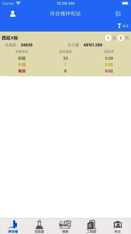 通过对初中、高中搅拌站超标数量和超标率的监测,实现对生产查询数据、超标查询数据和物料核算数据的监控